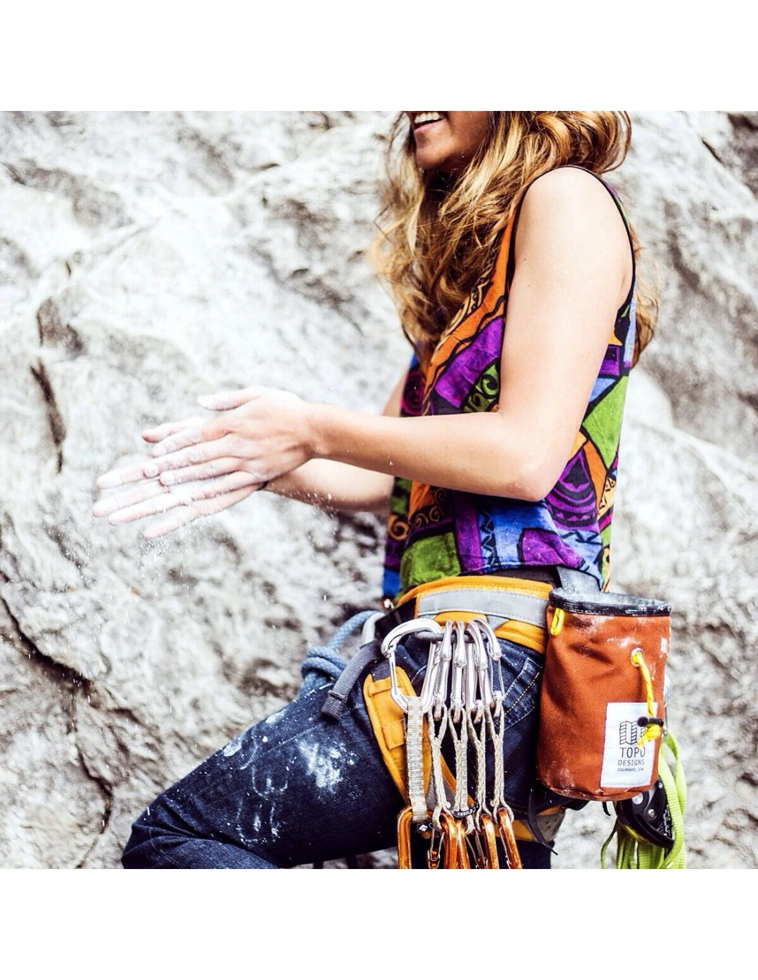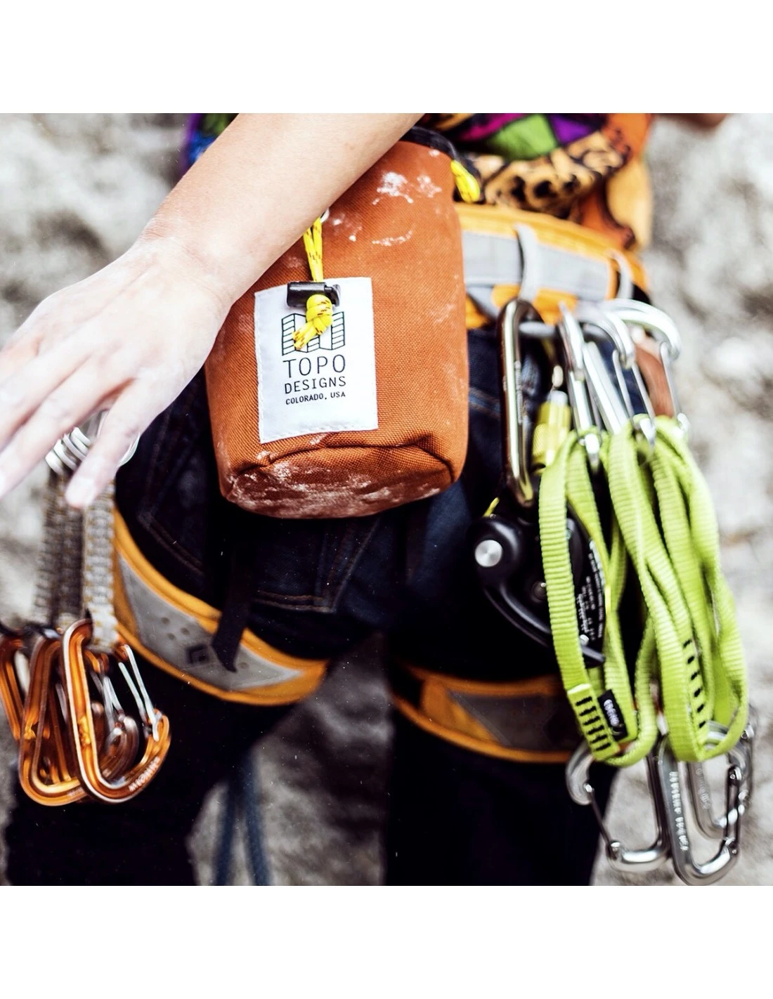 All you need to send your boulder project is a pair of shoes and the Chalk Bag. The smooth pack cloth neckline wicks chalk down into the soft fleece body interior, keeping chalk in the bag and off your gear. All Chalk Bags are made in Colorado.