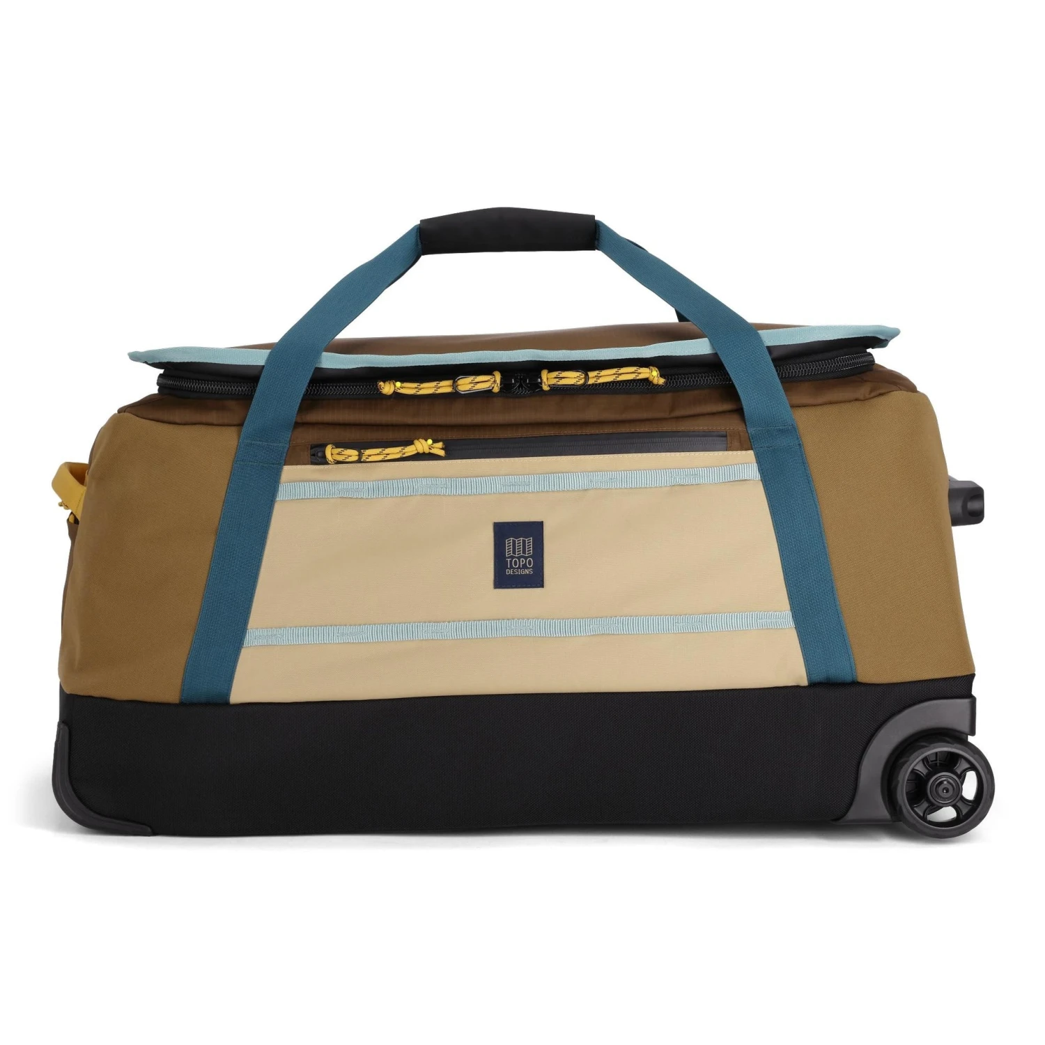 The 90L roller duffle features a telescoping handle, crushproof wheels, external stabilizer bar, and bottom panel rails. It includes water-resistant lining, a front zip pocket, interior mesh pockets, padded nylon grab handles, and a top valuables pocket with a key clip.