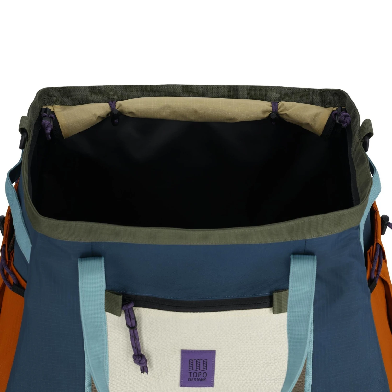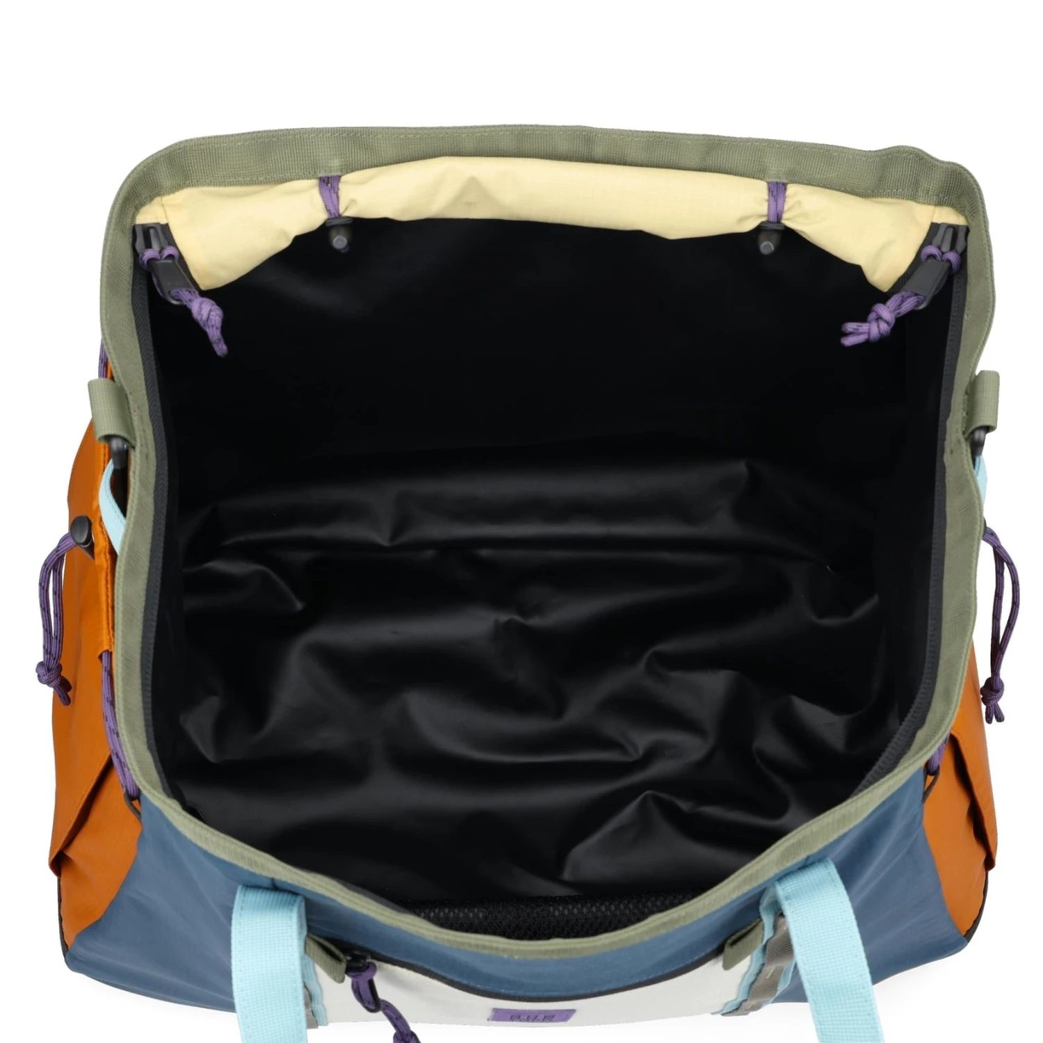 Materials: 1000D recycled nylon, 200D lightweight recycled nylon, 10 oz vinyl tarp liner